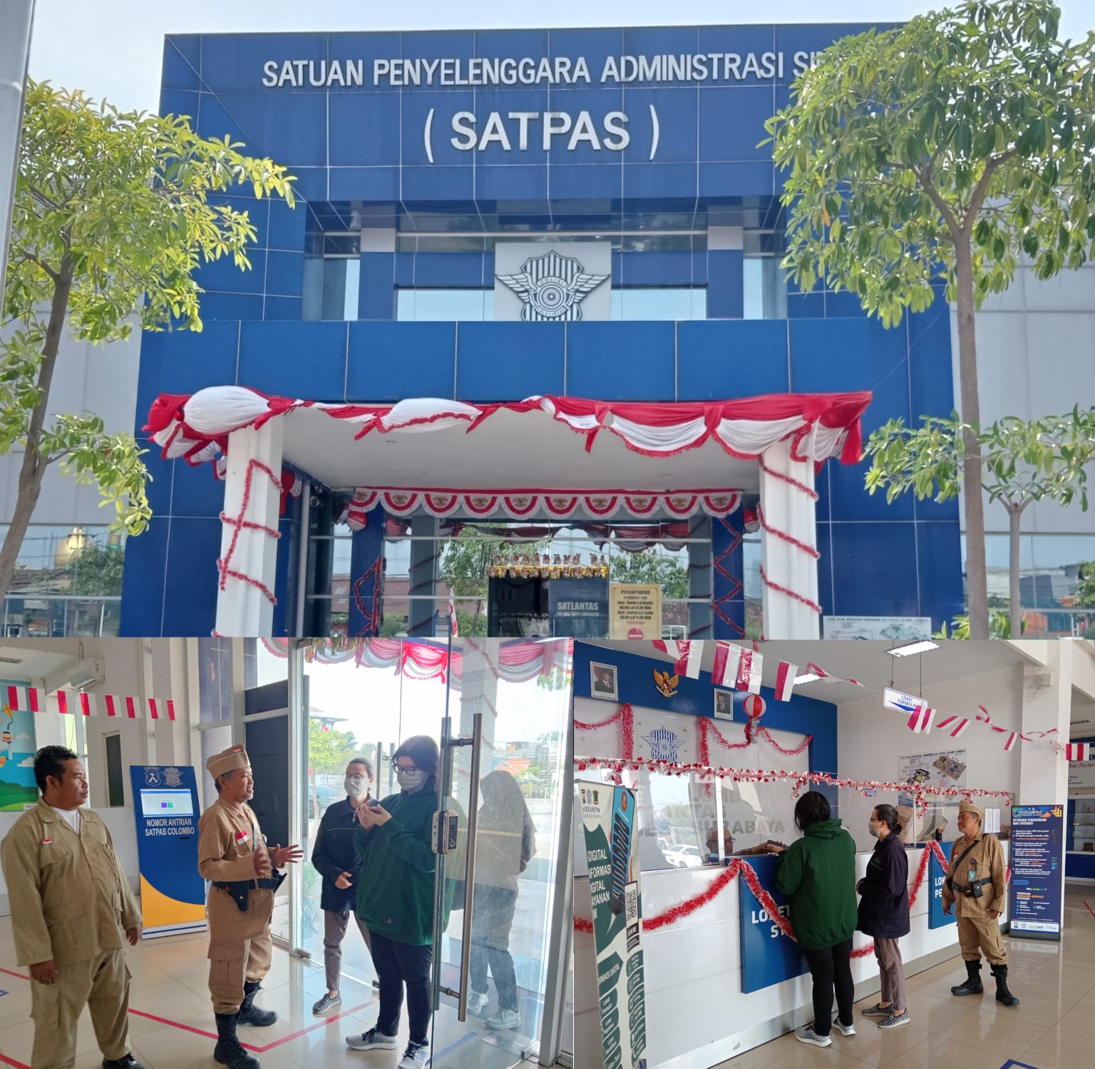 SURABAYA – Menggelorakan semangat perjuangan para pahlawan bangsa yang telah gugur di medan laga, Petugas Satpas SIM Colombo Polrestabes Surabaya kenakan baju pejuang veteran saat melayani masyarakat dalam pengurusan surat izin mengemudi (SIM).